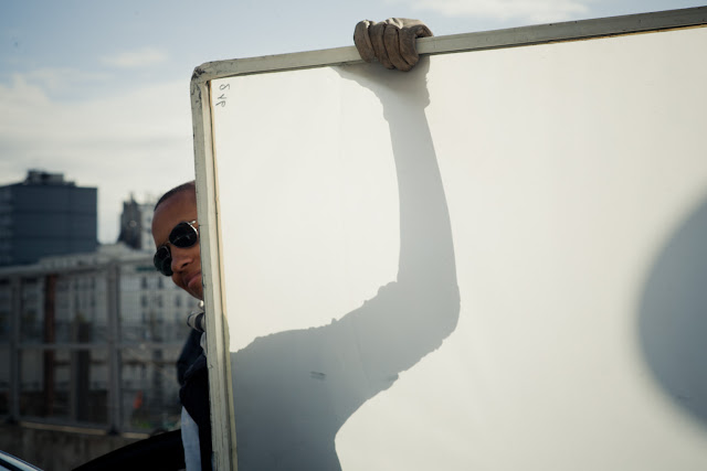 L'ambiance est décontractée depuis la fin de la grosse journee d'hier, et le timing s'en ressent. Nous commençons a shooter affreusement tard, à 14h50. Nous avons posé la bagnole dans un couloir de bus et avons dévié la circulation, sans en avoir tout à fait l'autorisation. Pourtant, les rondes de Police se succèdent et personne ne nous demande rien.